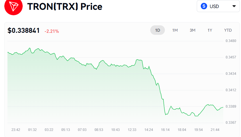 - TRX declined 2.21% to $0.3388 but found stability near $0.336, suggesting potential accumulation and a pause before recovery.