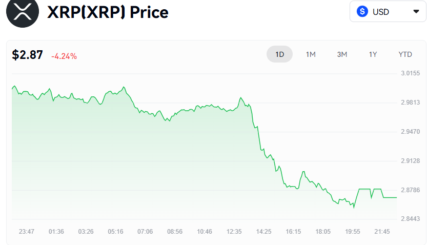 XRP experienced a pronounced decline, falling 4.24% to $2.87 after peaking slightly above $2.98 earlier in the day. The chart reveals a sharp mid-session drop, followed by limited rebound attempts that failed to break above $2.90, confirming persistent selling pressure. The steep descent mirrors a shift in sentiment after a strong prior run, suggesting profit-taking and reduced intraday momentum.