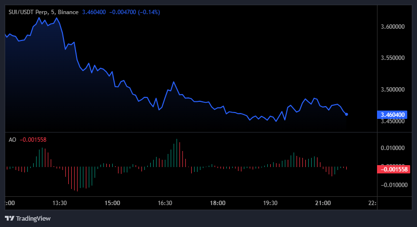 SUI continues to trade under mild downward pressure as price action moves from $3.55 toward $3.46. The short-term decline reflects consistent selling momentum confirmed by negative AO readings. However, recent histogram patterns show smaller bars, suggesting reduced volatility and the potential for stabilization.