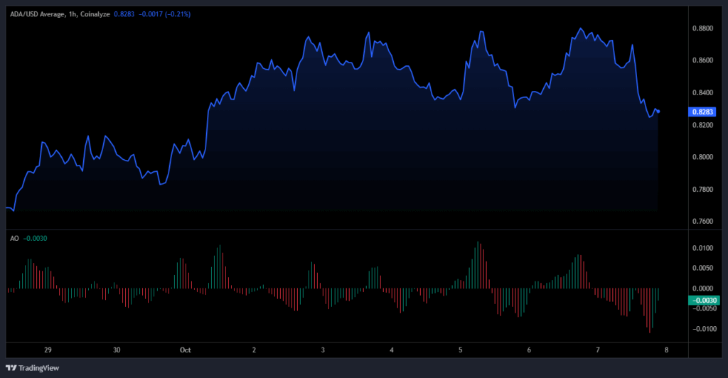 Bullish pressure is being cooled, the recent move towards weaker red bars is a sign of weakening of green AO bars. Nonetheless, ADA has been stable above $0.82, which would indicate a possible reversal in case stability in price is maintained. The breach at this level might result in a retest of $0.85 or 0.86 and this will restore favorable mood among the market participants.