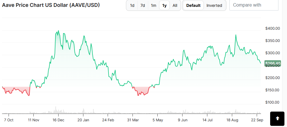 Aave recorded sharp movements over the past year, climbing above $400 in December before facing a steep correction. However, the asset stabilized within the $250–$300 range by late September, creating a significant support level. This pattern demonstrates a shift from extreme rallies toward consolidation.