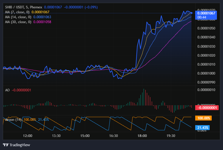 SHIB demonstrated strong technical resilience, climbing sharply after an extended consolidation phase. The token reached 0.00001067 USDT after a surge that lifted it above key moving averages. All short-term indicators aligned positively, confirming a strong uptrend that started late in the session.