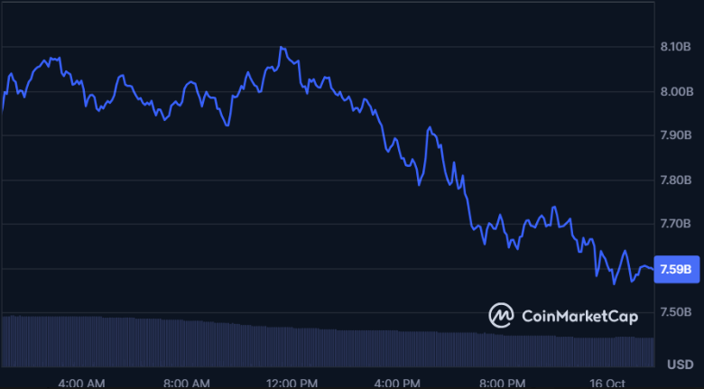 Hedera (HBAR) is trading at $0.179, posting a 5.06% decline in the past 24 hours, with a market capitalization of $7.59 billion. The asset has shown a consistent downward slope throughout the trading day, erasing earlier gains near the $8 billion level. The 42.26% drop in trading volume signals declining market participation, reinforcing the ongoing bearish momentum.