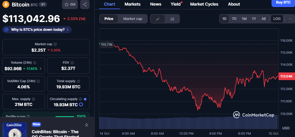 Bitcoin traded near $113,042 after experiencing early weakness and a 2.33% daily decline. The coin’s market capitalization reached $2.25 trillion, supported by strong liquidity and consistent trading. Volume surged 17.92% to $92.96 billion, reflecting steady participation from large market players.