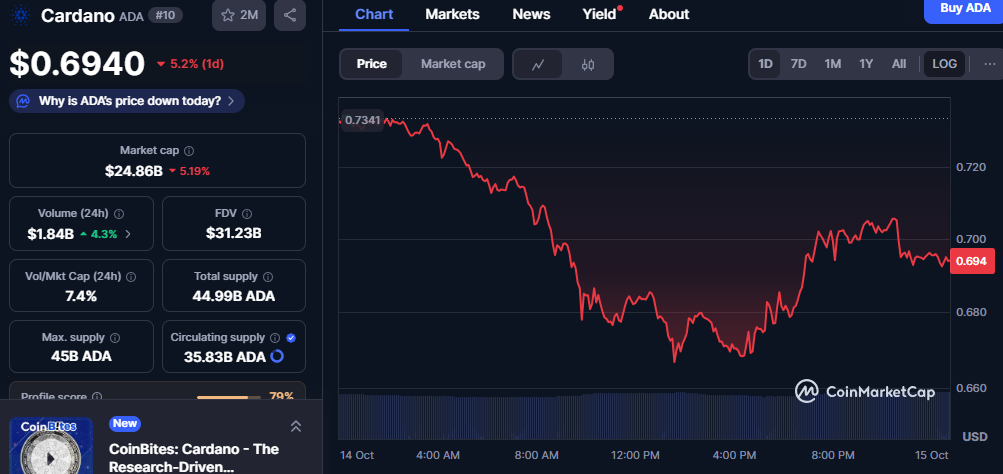 Cardano traded at $0.694, registering a 5.2% daily loss yet drawing notable accumulation from large holders. Its market capitalization stood at $24.86 billion, while trading volume increased 4.3% to $1.84 billion. The decline reflected short-term weakness but also created opportunities for strategic accumulation.