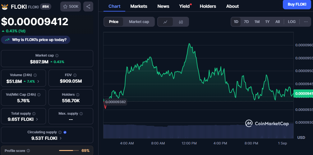 Floki (FLOKI) traded at $0.00009412, marking a mild 0.43% gain in a session, with market cap rising to $897.9 million. Trading activity improved as daily volume rose 7.4% to $51.8 million, lifting the volume-to-market cap ratio to 5.76%. FLOKI’s circulating supply stood at 9.53 trillion tokens, nearly matching the 9.65 trillion total supply.