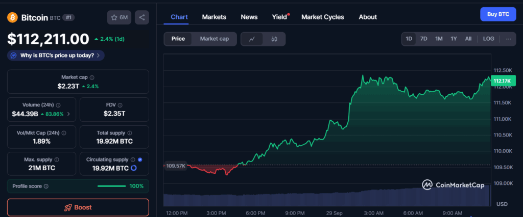 Tracking the exchange price of BTC at the time of press, CoinMarketCap data reveals that Bitcoin recorded a strong upward movement over the last trading session, climbing to $112,211 by press time. The chart shows the price opening near $109,570 before entering a period of downward action in early trading hours. That decline was followed by a steady recovery, with gradual gains pushing the asset back above the $110,000 level.