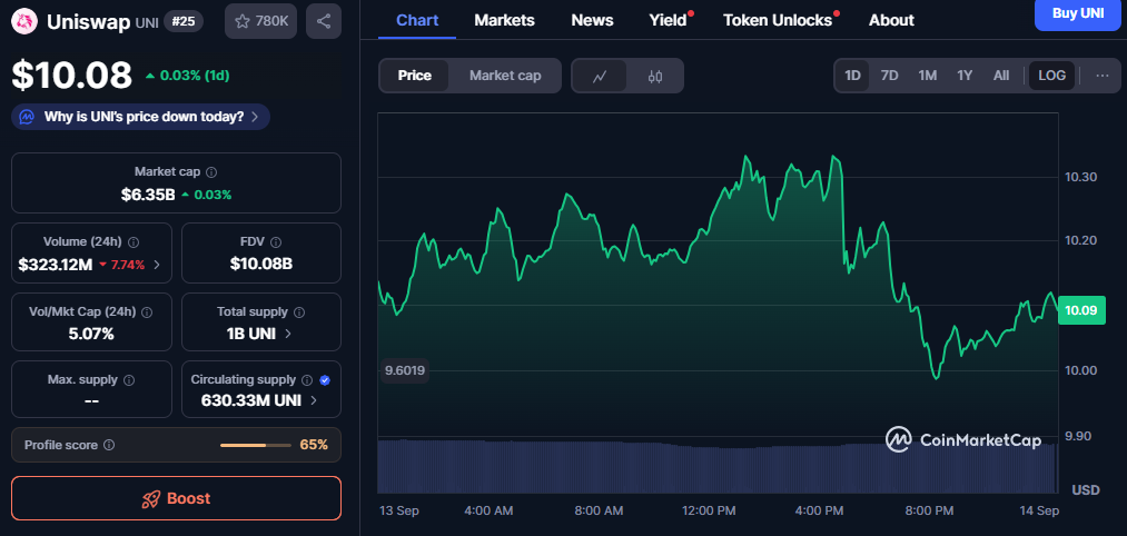 Uniswap was trading at a rate of 10.08 and had a marginal daily change of +0.03. The share was trading between 9.60 and 10.30 throughout the session. UNI rose to heights close to the midday and afterward reverted and settled just above 10.