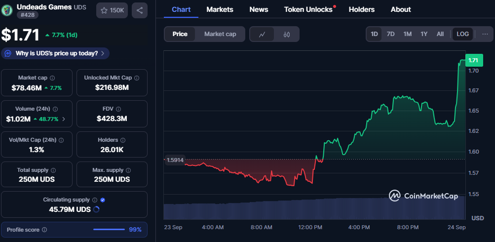 Undeads Games trades at $1.71 after advancing 7.7% in a single day. Its market capitalization has reached $78.46M, while its fully diluted valuation stands at $428.3M. The token has a circulating supply of 45.79M out of a capped 250M, reinforcing scarcity.