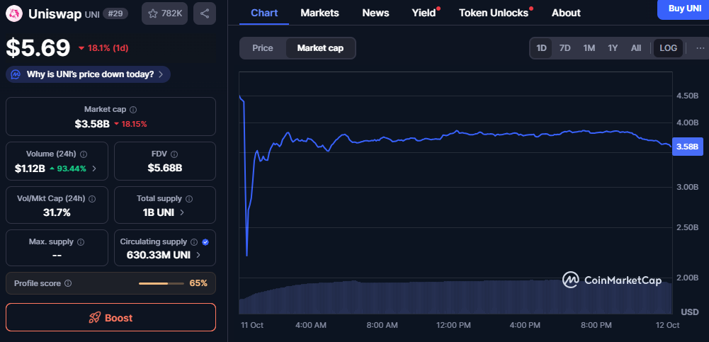UNI traded near $5.69 after dropping about eighteen percent during the session. Market cap hovered around $3.58 billion as the curve trended lower. Meanwhile, volume jumped roughly ninety-three percent to about $1.12 billion, signaling heavy participation.