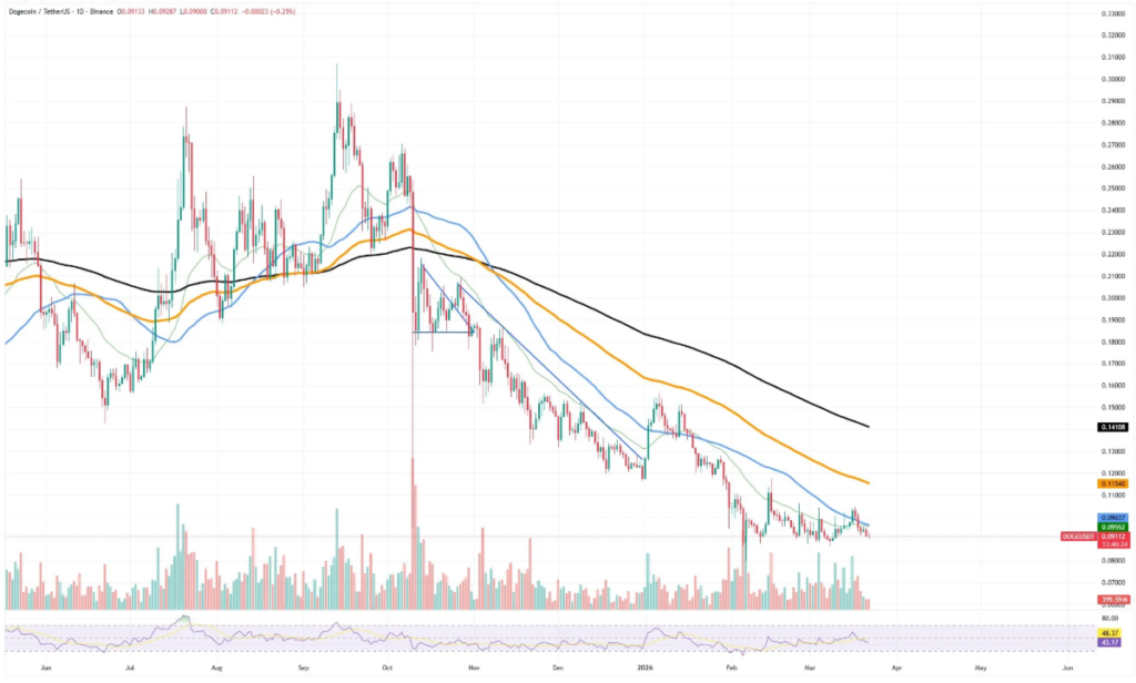 However, Dogecoin continued to struggle around short- and mid-term moving averages that many traders treat as resistance lines. The coin printed lower highs and only modest recoveries, and sellers defended each bounce before it reached the prior peak. Significantly, performance metrics reflected that pressure with a seven-day drop near 5% and a 30-day decline above 7%.