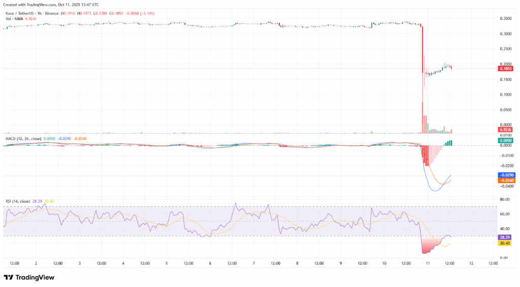 Despite bullish indications, risks are evident. If $0.15 fails to hold, the wedge pattern would be invalidated, opening the door to further declines and triggering stop-loss hunts below current levels.The recent sharp crash observed in Crypto space saw KAVA drop from $0.35 to $0.17 in hours amid extreme volatility, highlighting how fast sentiment can shift.