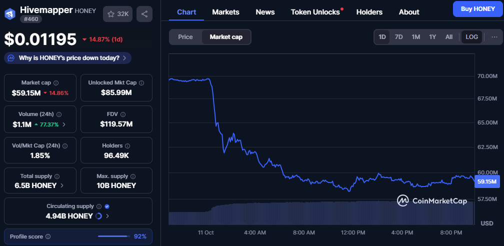 HONEY traded near $0.01195, down roughly 14.9% on the day. Market cap settled around $59.15 million after early weakness. Volume advanced about 77% to roughly $1.1 million, which signaled engagement throughout the drop.