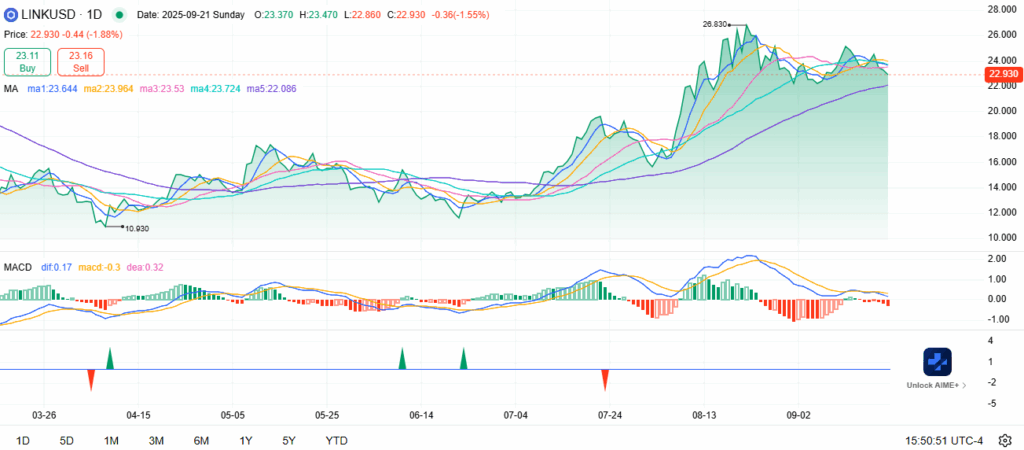 Chainlink trades at $22.93 after pulling back from a recent peak of $26.83. The token remains above its long-term base at $10.93, which underlines strong gains since earlier lows. Moving averages cluster around $23, confirming this zone as a critical battleground.