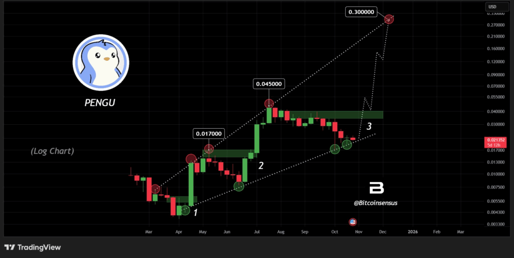 In October, the price dropped temporarily, but the upward trend quickly resumed, reaffirming the strength of the bull market. Current price action places PENGU around $0.021, still within the established bullish channel. The next key resistance target at $0.30 indicates potential for continued growth. The long-term outlook remains positive, supported by the steady strength in the PENGU community. This steady market movement signals confidence in the token, with a solid trend set to test higher resistance levels moving forward.