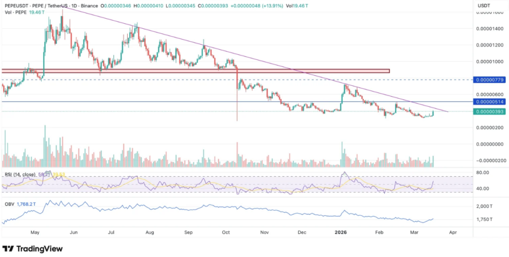 Despite the recent strength, the price still faces a longer-term technical barrier. Pepe continues to trade under a descending trendline that has capped recovery attempts since mid-2025.