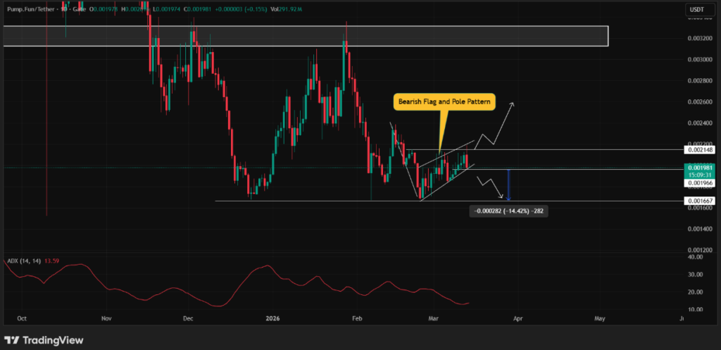 - Technical charts show a bearish flag pattern forming, which could push PUMP toward lower support if the token closes below $0.00196 soon.