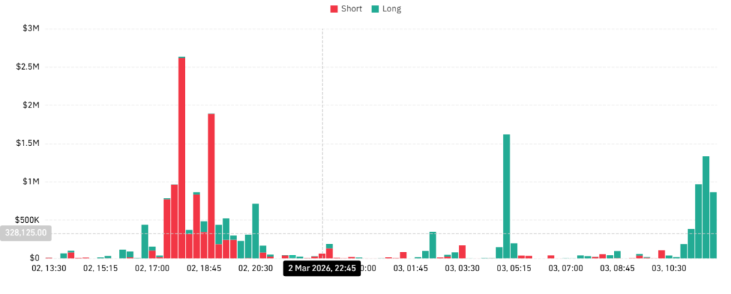 The Coinglass liquidation chart displays significant short liquidations earlier, highlighted by tall red bars clustered on the left. More recently, green bars have increased, indicating rising long liquidations. This shift reflects changing leverage dynamics, with concentrated liquidation spikes suggesting heightened volatility around nearby price levels and key thresholds.