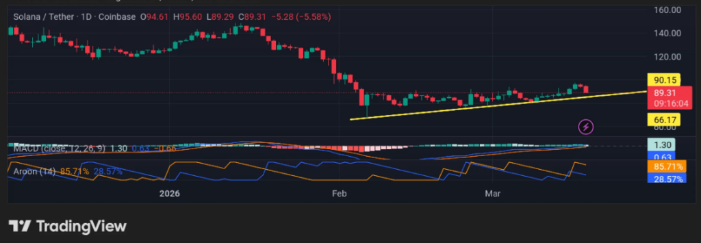 However, a break below the $80 level could weaken the current structure and open the door to deeper losses. At the time of writing, Solana traded near $89, reflecting ongoing market pressure.