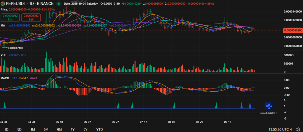 The short-term moving averages remain above current prices, creating a layer of overhead resistance. However, their gradual convergence indicates growing balance in the market. A decisive daily close above $0.00001000 would mark a reversal and shift momentum in favor of buyers.
