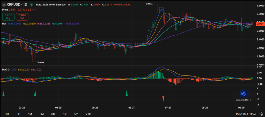 XRP traded near $2.95 on Saturday, recording a 2.61% decline as mild selling emerged across the digital asset market. The token moved between $2.91 and $3.03, reflecting moderate volatility through the session. Despite the drop, XRP held its crucial levels, maintaining a steady technical structure after earlier mid-year gains.