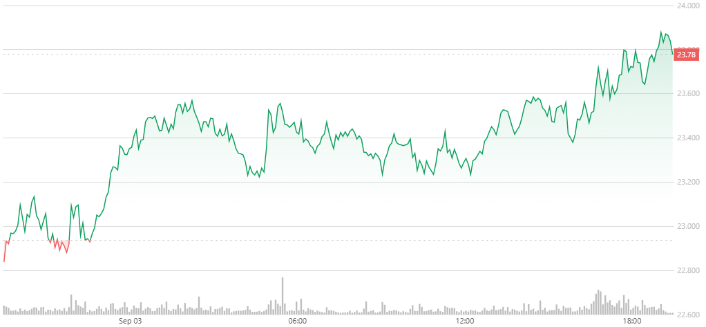 Chainlink has been moving with remarkable momentum and it has closed at $23.76, after increasing by 4.00 in the day. The token dropped to almost twenty-three dollars early in trading, but then recovered swiftly and moved steadily upwards. It reached a high of about $23.80 again with some slight pullback and settled solidly up at the highs.