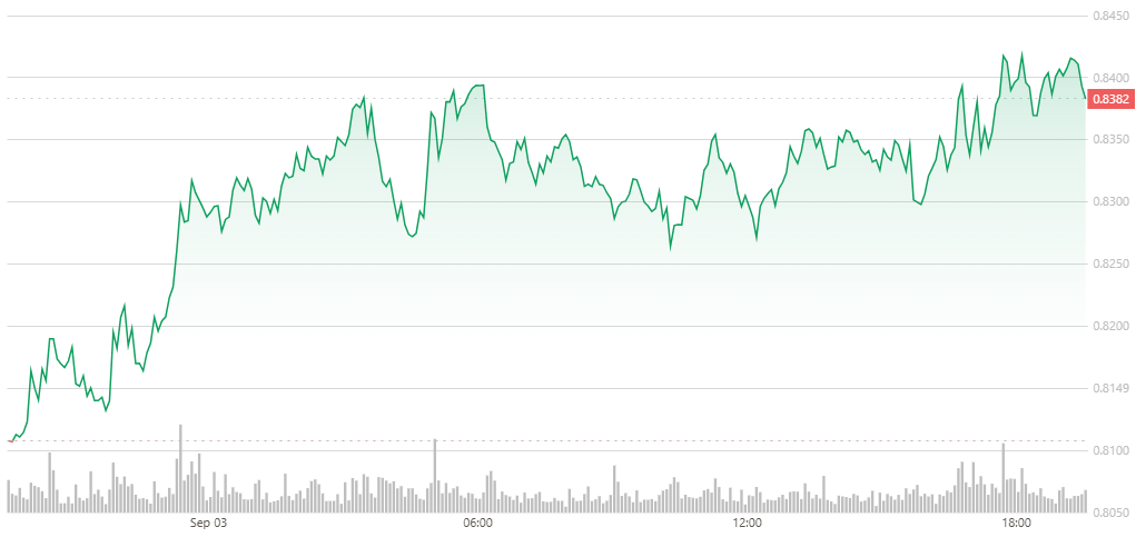 Cardano registered a notable advance, closing at $0.8396 after a 3.68% gain during the past 24 hours. The coin slipped near $0.815 early but staged a steady recovery through the session. It has crossed over 0.835 before closing towards the highs which indicates good momentum.