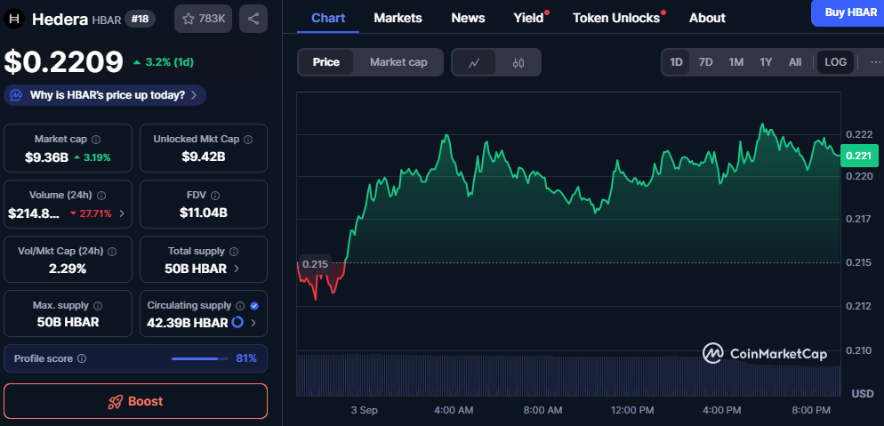 The project’s market capitalization stands at $9.37 billion, with 42.39 billion HBAR in circulation from a 50 billion capped supply. Its fully diluted valuation (FDV) sits at $11.05 billion, reflecting alignment between circulating and total supply. Limited dilution risk strengthens confidence in long-term fundamentals.