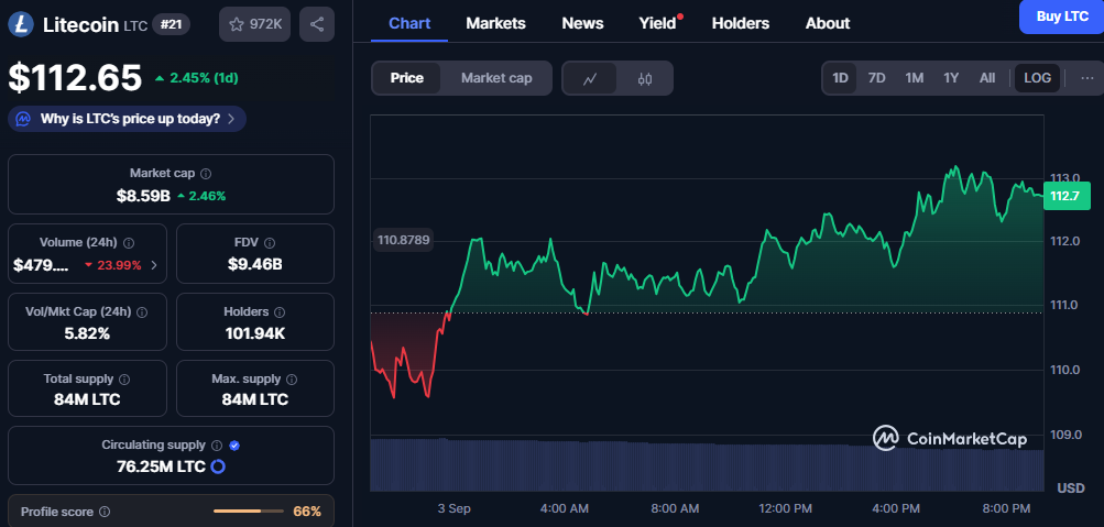 Trading volume hit $479 million, recording a 23.99% decline from prior sessions. Despite reduced activity, Litecoin’s volume-to-market cap ratio at 5.82% signaled strong liquidity. Price stability above $112 reflected firm support from existing buyers.