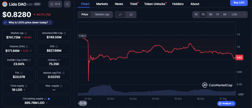 At the time of press, Lido DAO’s token (LDO) is tracking a notable decline, down 30.11% over the past week, despite the announcement, with no positive trend evident.CoinMarketCap data shows that the token is valued at $0.8280, and its market cap is $741.73 million. The 24-hour price trading volume is at 171.94 million, which is a 3.7 percent reduction.