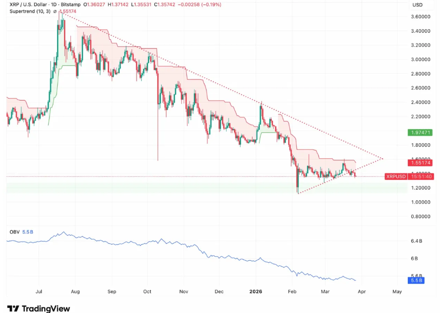 The $1.40 level has acted as a firm ceiling since late February, limiting upside momentum across multiple sessions. However, the broader structure shows converging trendlines between $1.30 and $1.60, narrowing the trading range steadily. Consequently, a daily close above $1.40 could shift focus toward the $1.551 Supertrend resistance, which has remained bearish since February.